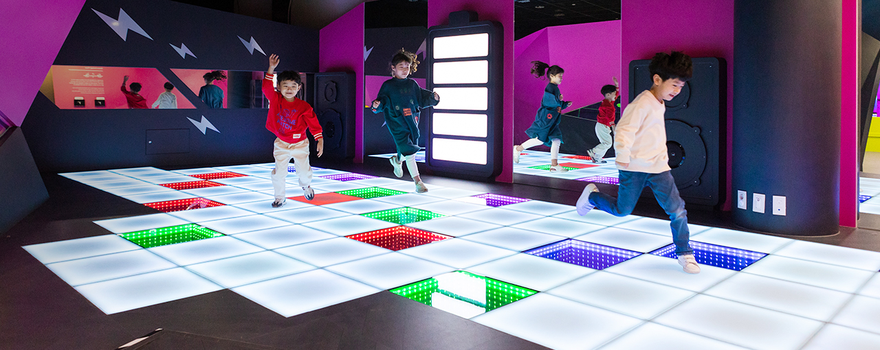 激しくステップを踏んで踊ると、その力が電気に変わります。自分が作り出した電気で徐々に華やかになっていくステージ!