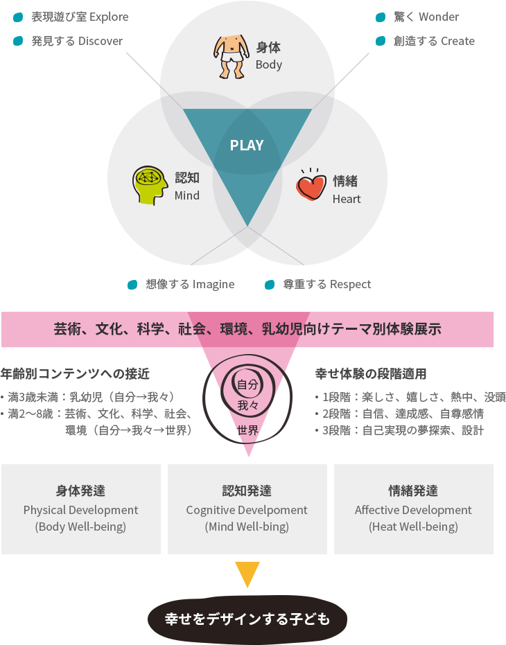 「幸せをデザインする子ども」は、ソウル子ども博物館の全ての展示に共通した趣旨であり展示コンセプトです。 ソウル子ども博物館は子どもを足りない部分を補充し、世話をするべき受動的な対象と見るのではなく、主導的に 幸せな人生を追求し創造していくことができる能動的な主体とみなし、その概念にもとづいて展示プログラムを設計しています。 子どもにとって遊びは自分と世界を知るための大切な過程であり、身体、認知、情緒の全人的な発達を助ける学習です。 そのため、子どもの遊び体験を重要視する子ども博物館の教育哲学を反映させた展示作りに尽力しております。 ソウル子ども博物館は乳幼児と満8歳以下の子どもの発達段階別の特性を考慮し、自分から我々、世界へと思考を広げていく 接近方法を採用しています。芸術、科学、文化、空間、自然、身体、感性などの多分野にわたる展示テーマを遊びと 体験活動の目的に応じて扱い、子どもが幸せな展示を提供できるよう努力しています。